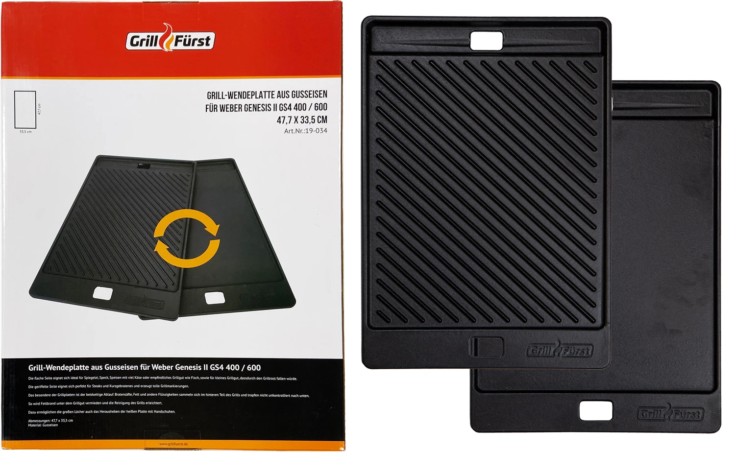 | Bezeichnung | Grillfürst Grillplatte Gusseisen für Weber Genesis II 400 / 600 48 x 33,5 cm |