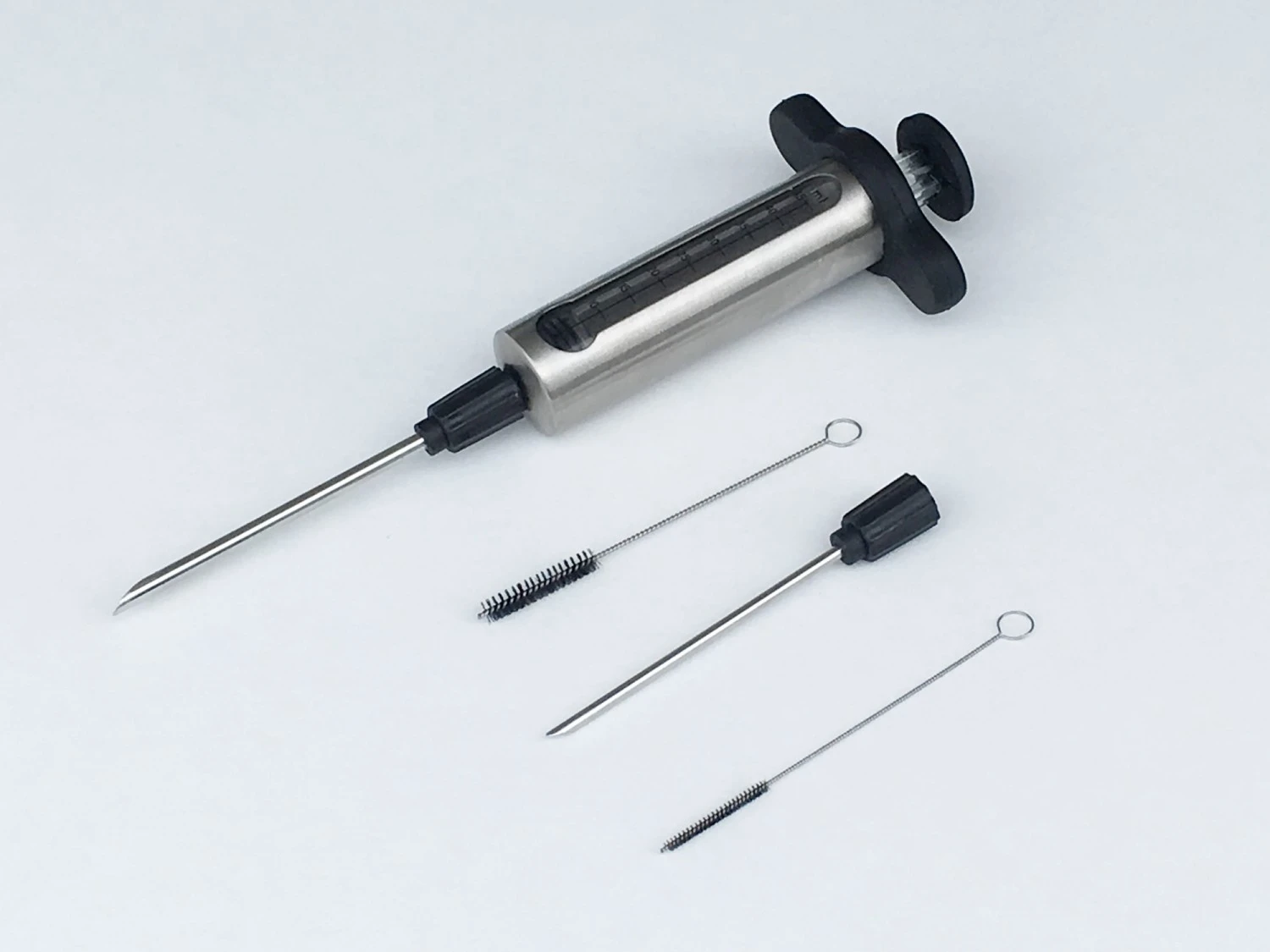 Aufbewahrungsbox, Marinierspritze, große Nadel Innendurchmesser 4mm inkl. Reinigungsbürste, kleine Nadel Innendurchmesser 2mm inkl. Reinigungsbürste