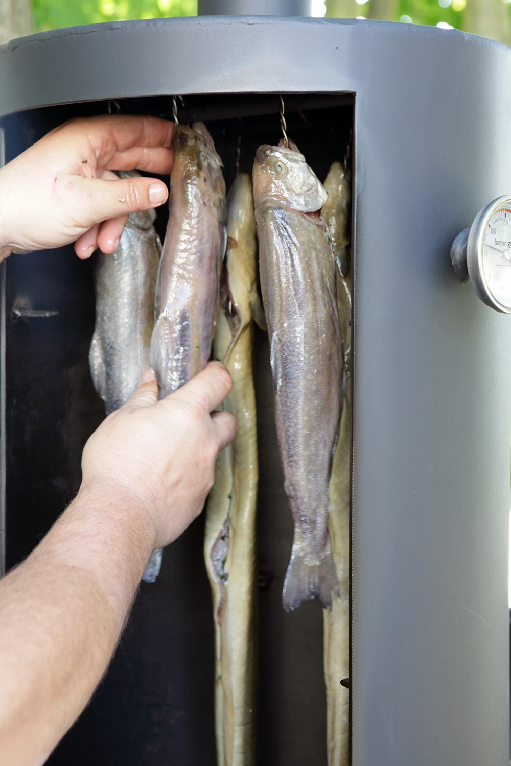 - großer Räucherturm – mit 3 Grillrosten und Querstangen für Räucherhaken