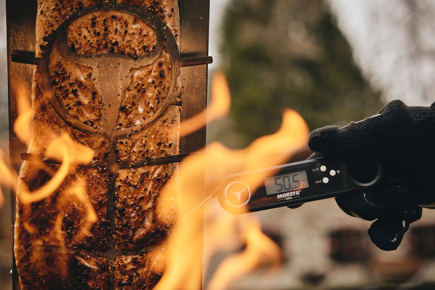 Mit einer Auflagefläche von 60 x 19 cm ist das Flammlachsbrett extra groß und bietet genügend Platz selbst für ganze Lachshälften. Ein besonderes Highlight ist das Moesta Stierkopf-Logo, dass sich während des Grillen in den Fisch einbrennt.