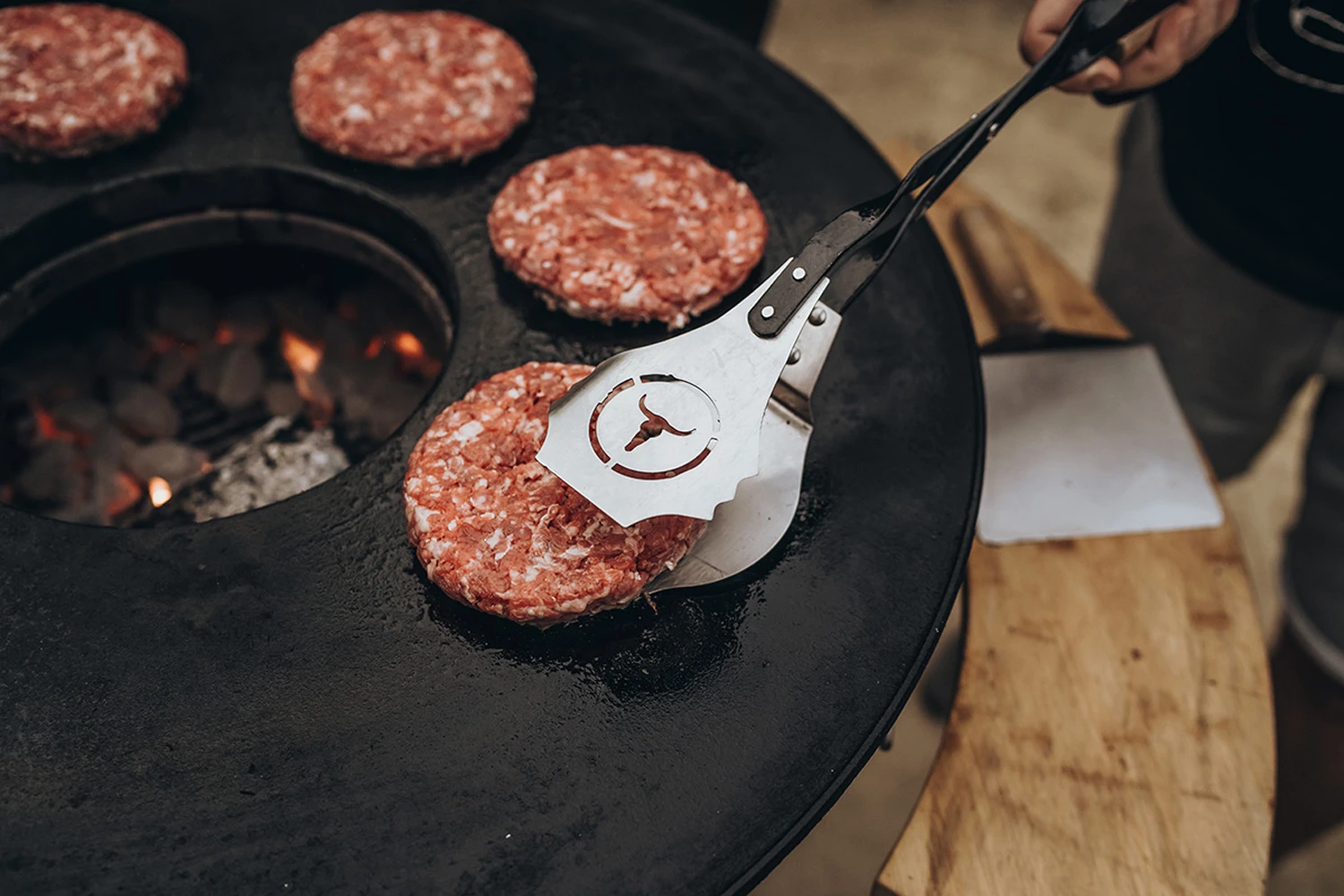 Die Moesta Burgerzange ist speziell dafür entwickelt, um Burgerpatties schnell und sicher zu wenden.