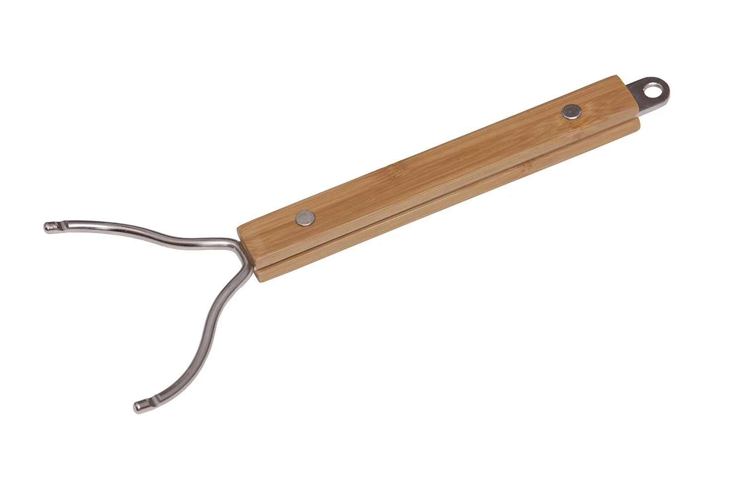 Der robuste Grillrost-Heber besteht aus rostfreiem, poliertem Edelstahl und besitzt einen massiven Griff aus Bambusholz. Damit liegt er sehr gut in der Hand und das Holz sorgt zusätzlich für eine Isolation der Wärme. Am oberen Ende ist eine praktische Öse zum Aufhängen integriert.