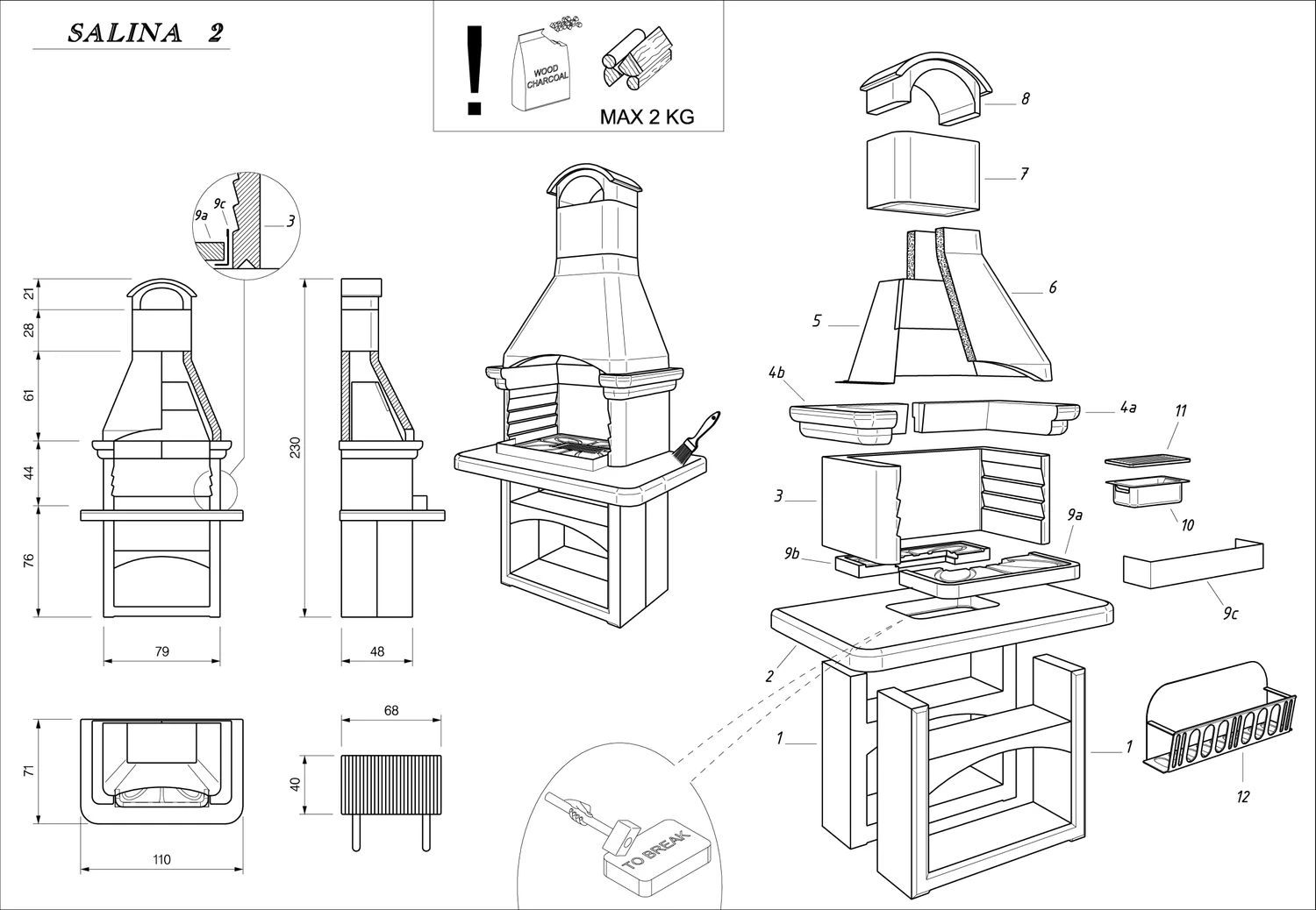 | Brennstoff: | Kohle und Brennholz max. 2 kg |