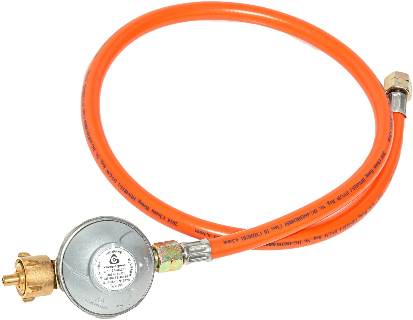 Druckregler mit Anschlussschlauch für die Rösle Videro G3 und G4 Gasgrills, aber auf für viele andere 50 mbar Geräte – auch von anderen Herstellern.