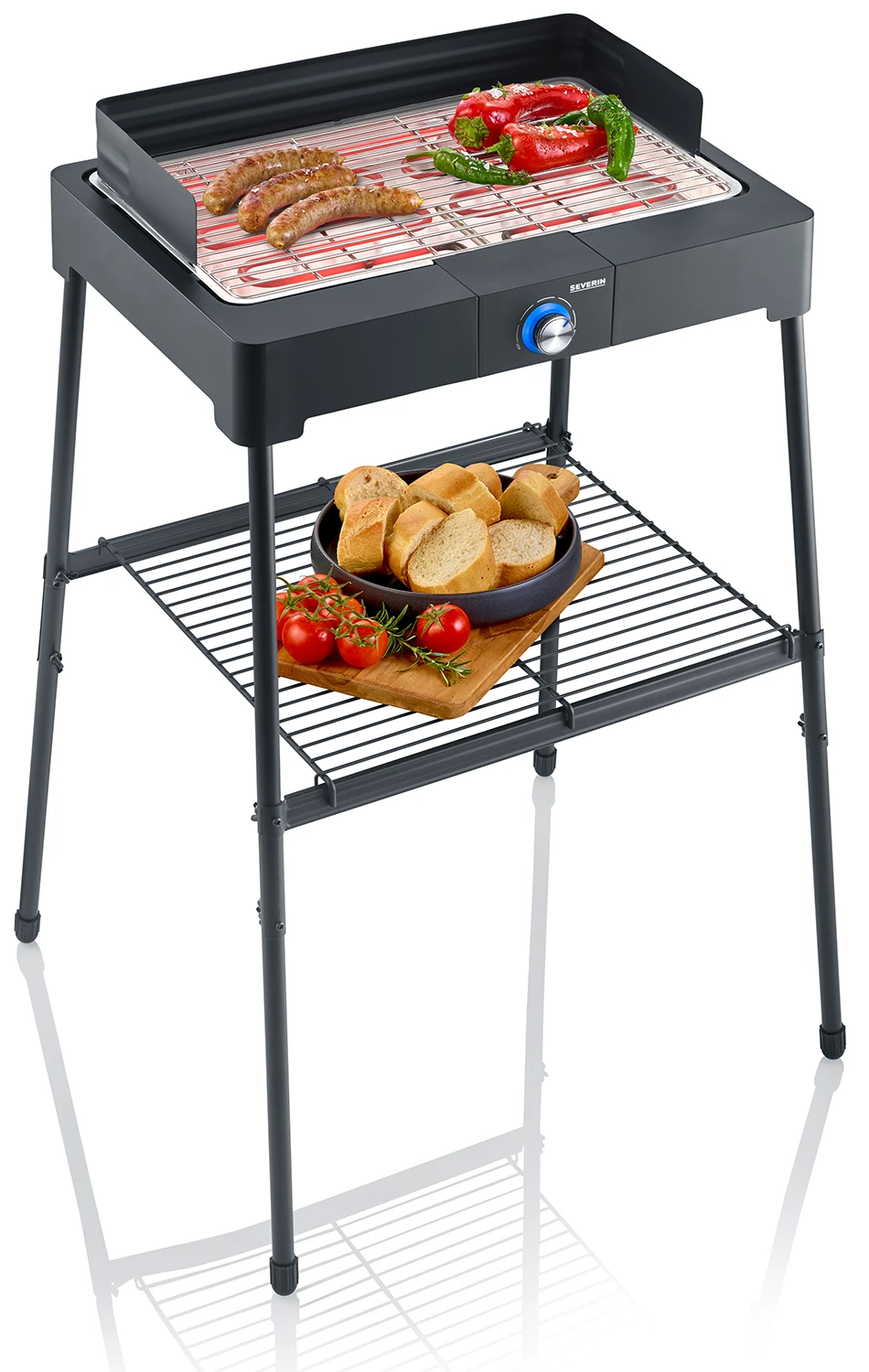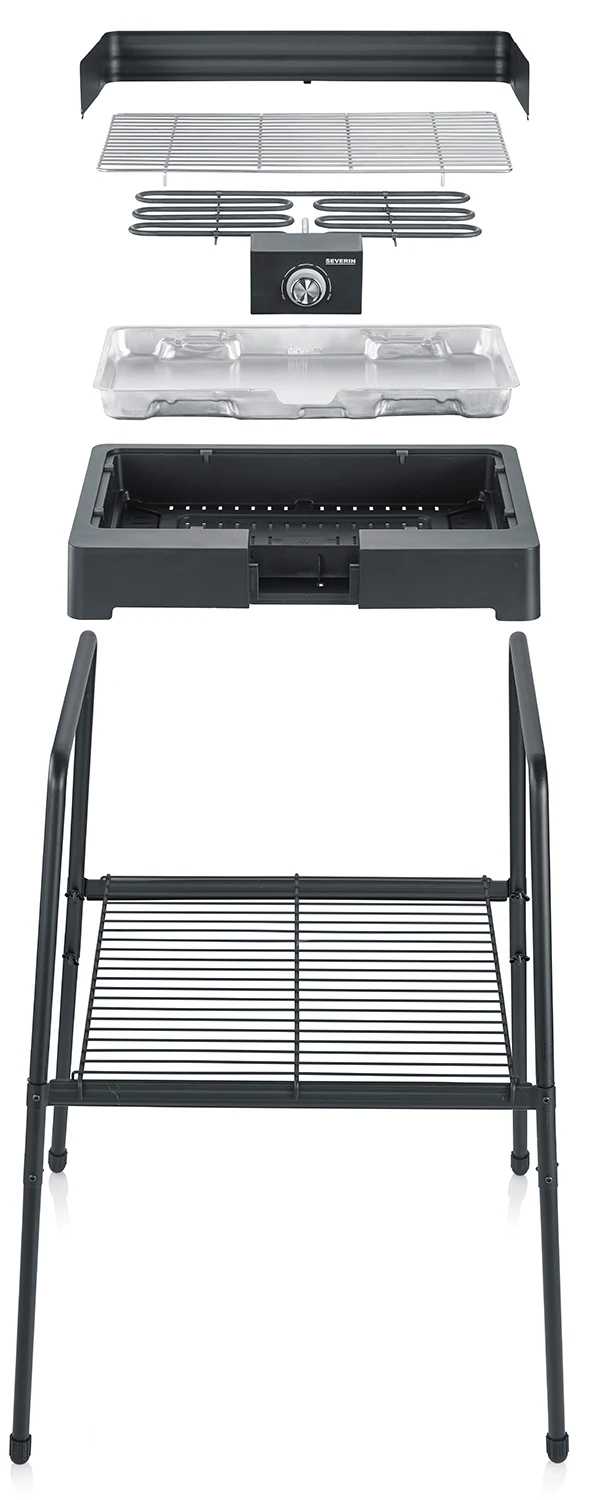 Der Severin PG8566 ist mit einem Untergestell inklusive einem Ablagerost ausgestattet. So können sie den Grill wahlweise als Tischgrill oder als Standgrill nutzen. Mit dem Untergestell bringt es der Elektrogrill auf eine Arbeitshöhe von 85 cm und findet mit seinen kompakte Maßen auch auf kleinen Balkonen problemlos Platz.
