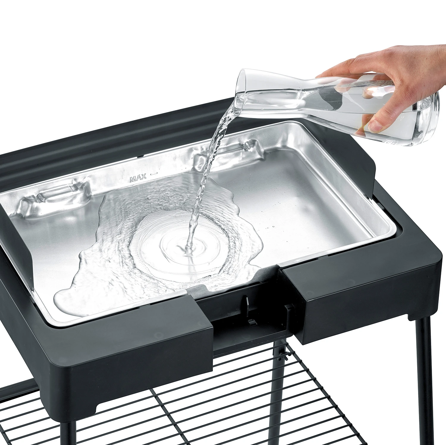 Vor dem Grillen wird die Grillschale mit Wasser befüllt. Das bietet gleich mehrere Vorteile: Heruntertropfendes Fett wird hier aufgefangen, damit Fettbrand verhindert und zusätzlich die Rauch- und Geruchsentwicklung deutlich reduziert. Dadurch kann der Severin Elektrogrill sogar in Innenräumen genutzt werden.