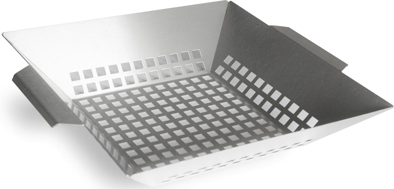 Perfekt zur Zubereitung von Gemüse und anderem kleinteiligen Grillgut eignet sich die die Thüros Gemüseschale aus Edelstahl. In der praktischen Schale kann das Grillgut gegart werden, ohne das etwas durch den Rost fallen kann.